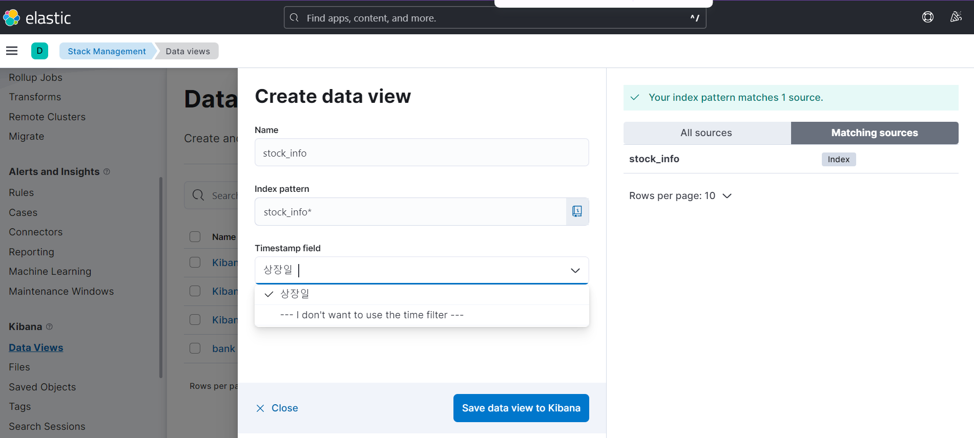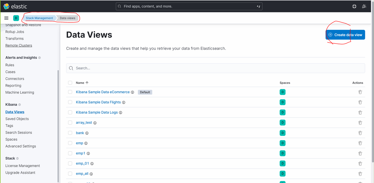 - Management → Stack Management → Create data view 선택