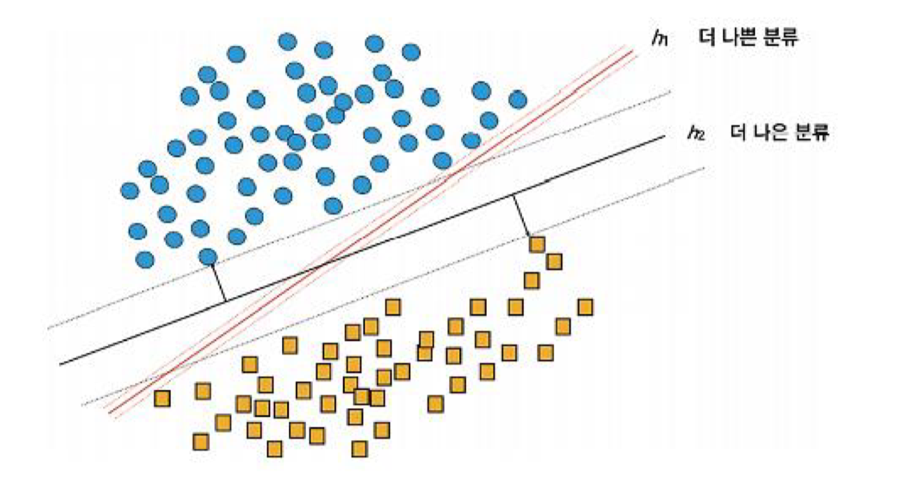 서포트 벡터 머신에서는 마진의 넓이가 큰 값이 될수록 좋은 값