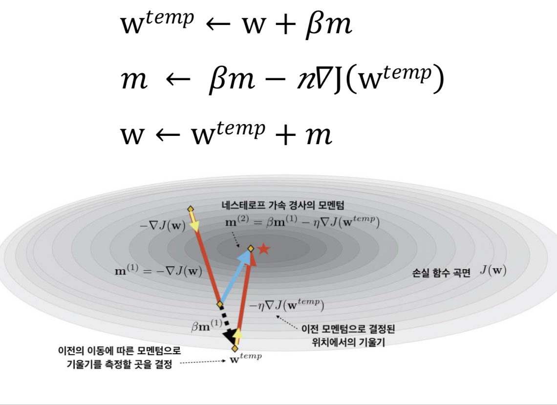 손실 함수 곡면의 기울기를 계산할 때 이전 모멘텀만큼 이동한 곳에서 기울기를 측정하여 이 기울기와 모멘텀을 함께 고려하여 최종적으로 이동할 곳을 찾는 것