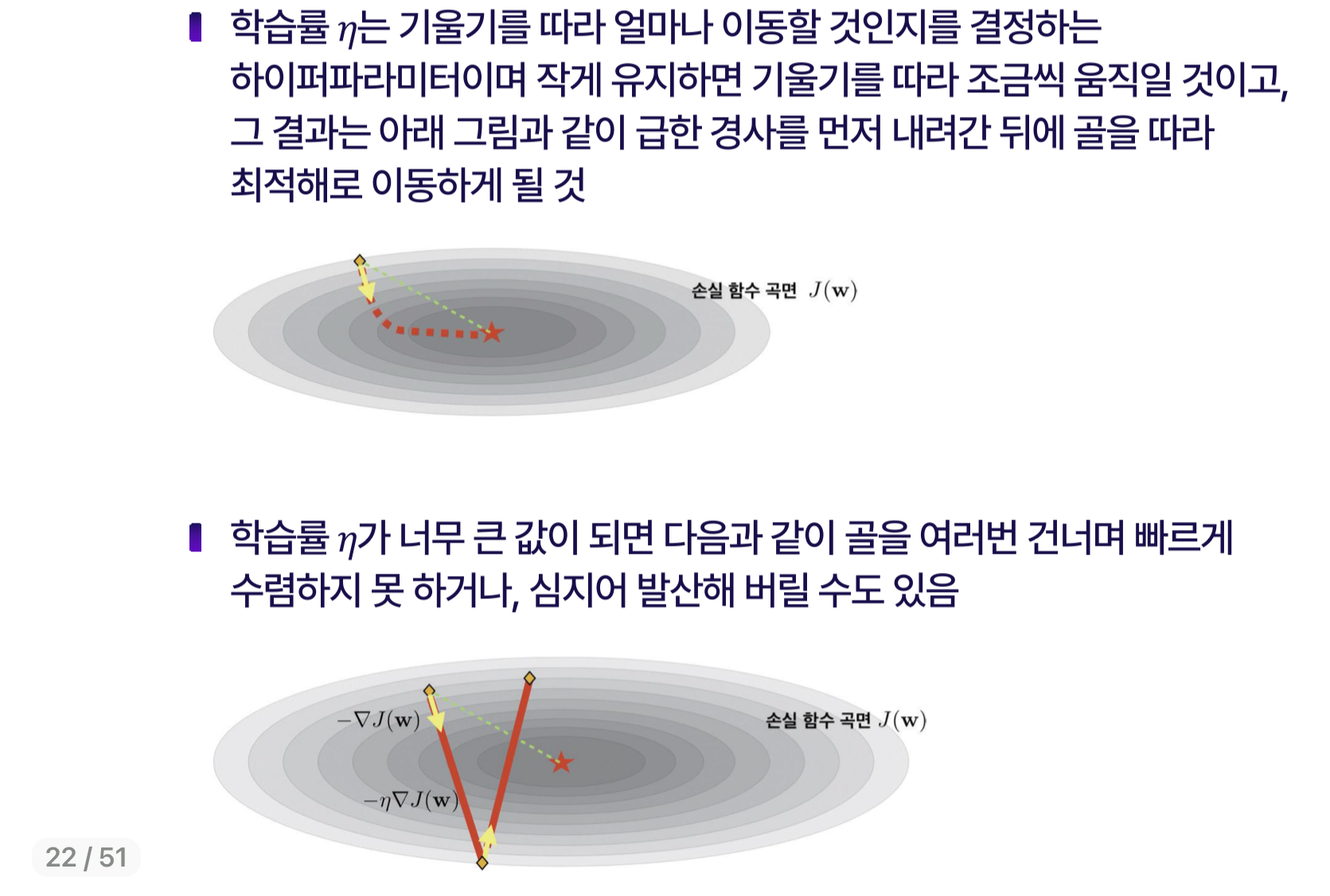 학습률은 기울기를 따라 얼마나 이동할 것인지를 결정하는 하이퍼파라미터이며 작게 유지하면 기울기를 따라 조금씩 움직일 것이고,