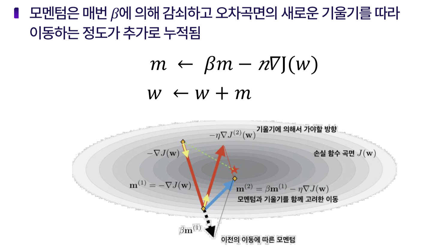 현재위치에서 계산된 기울기만으로 이동방향을 정하는 것이 아니라 지금까지 기울기를 따라 이동한 경로를 누적한 모ㅔㄴ텀을 정의하고 이를 이용해 파라미터 갱신