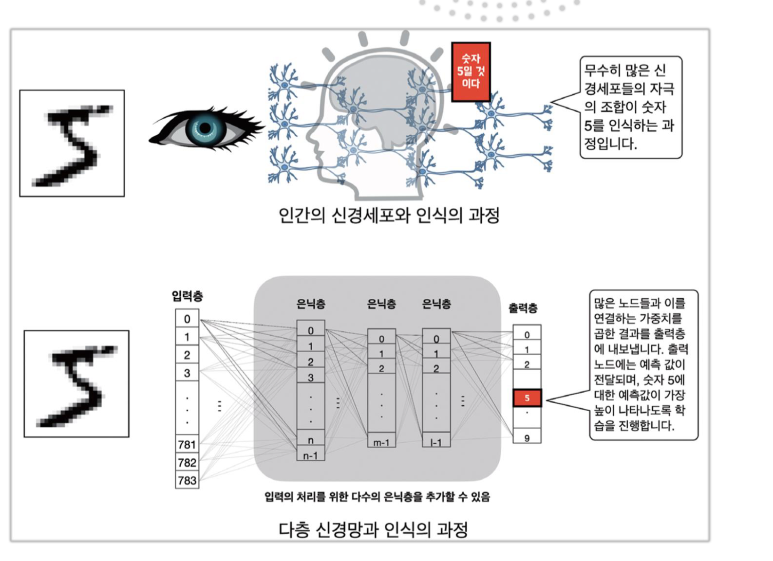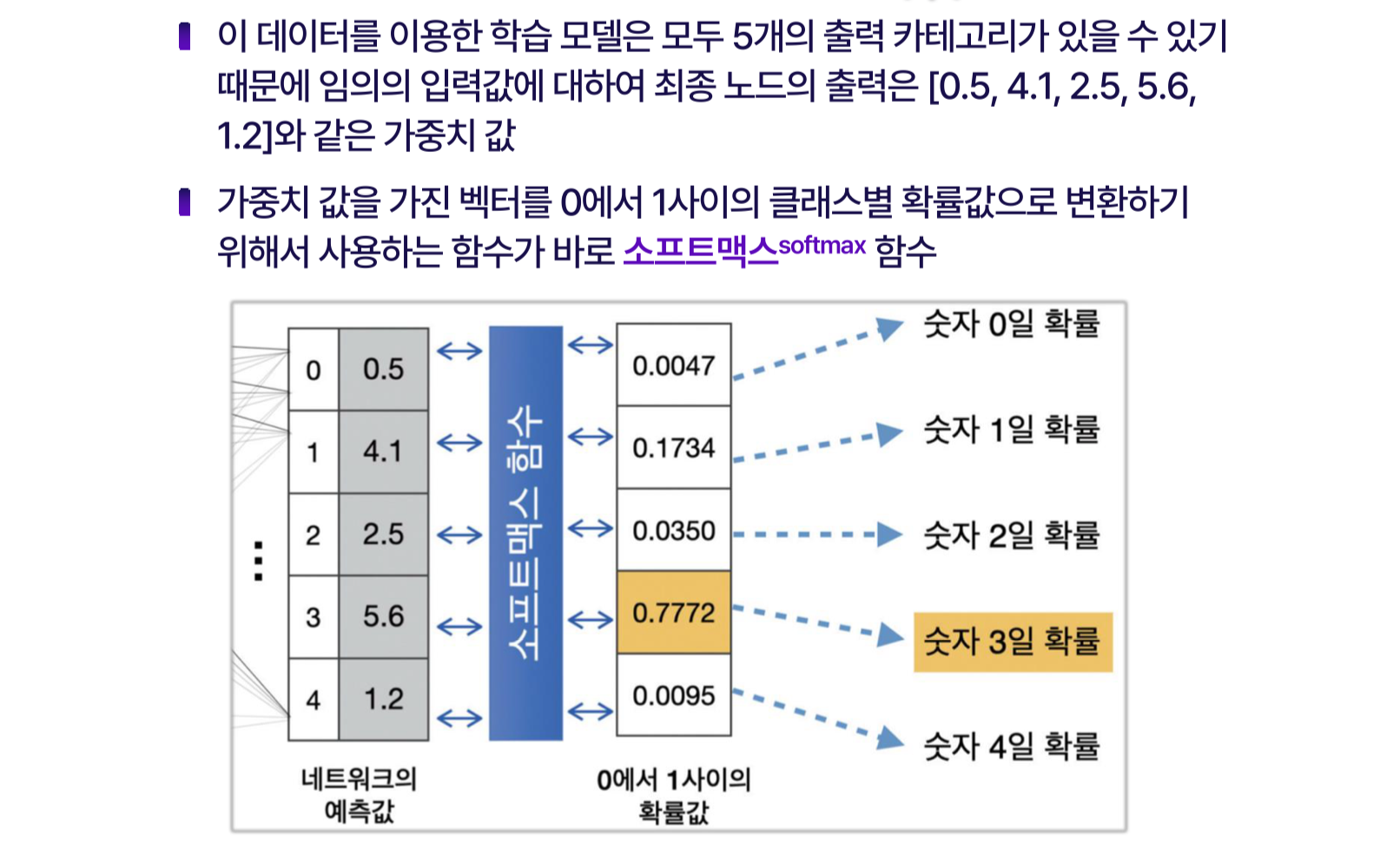 28x28크기의 이미지는 1차원 배열로 변환 경우 784개의 값이 되는데 이값이 신경 회로망을 통과하여 10개중 하나의 범주로 분류