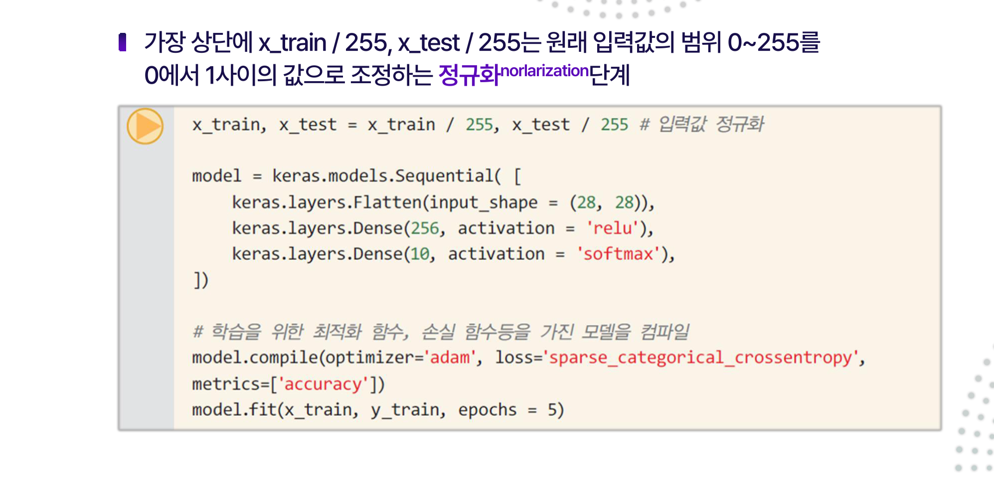 학습층을 만드는 명령이 keras.layers.Dense이며 Dense는 학습을 위한 연결을 밀집된 구조의 네트워크 층 혹은 완전연결층으로 한다는 의미