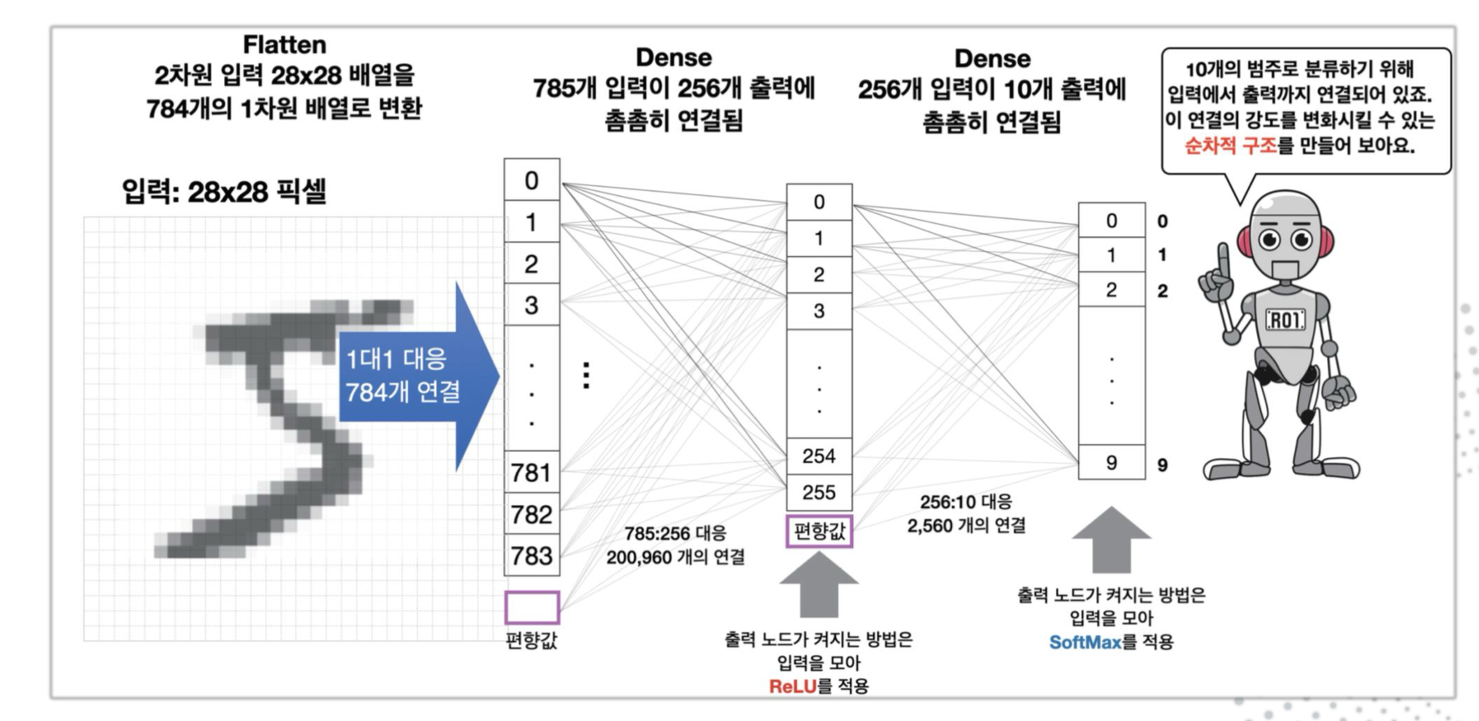 입력 데이터가 첫번째 은닉층을 통과할 때 784개의 입력과 1개의 편향값(784+1)에 대하여 256개의 은칙층 노드간의 연결이 필요하므로