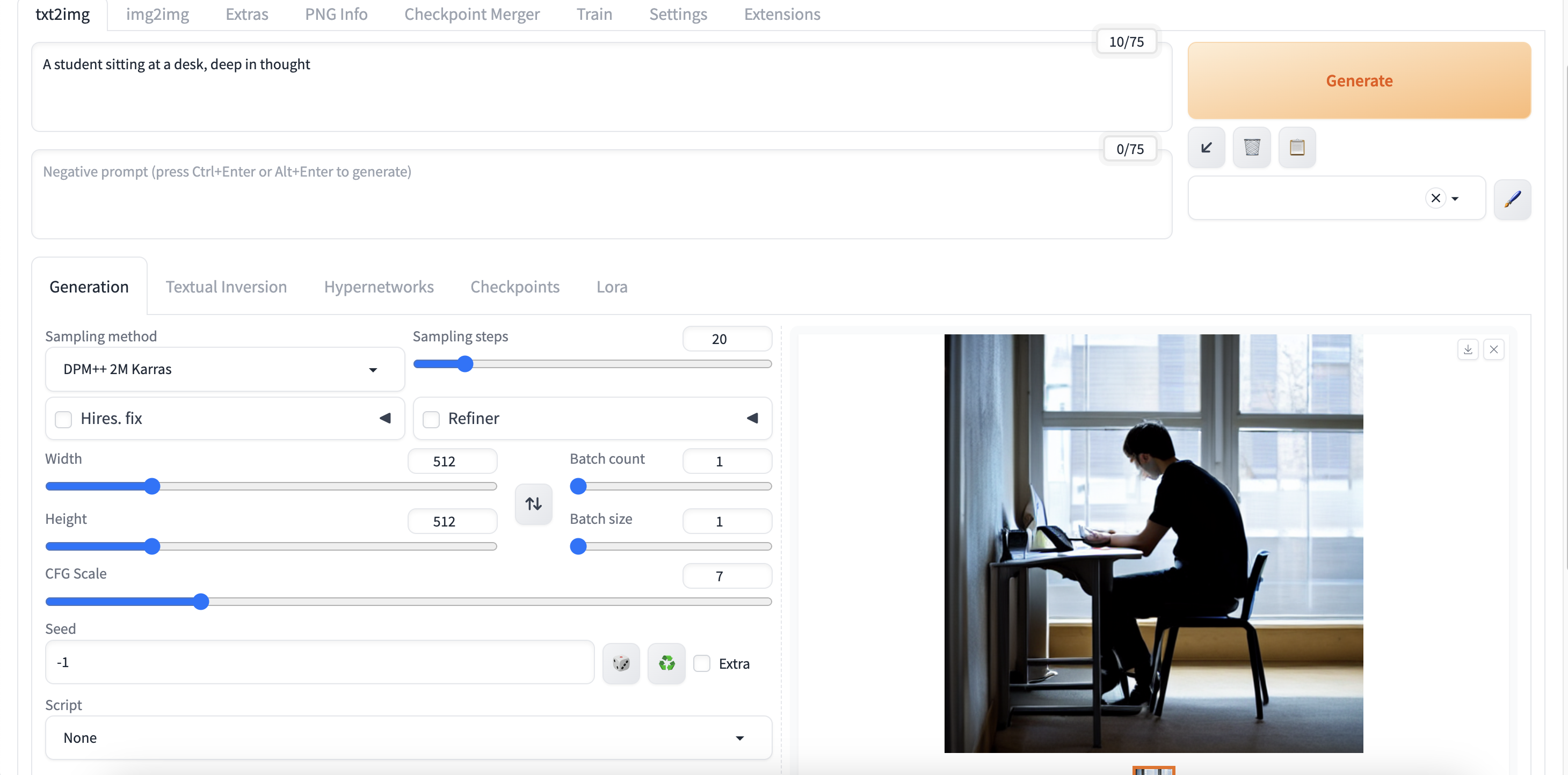 test를 하기 위해 prompt에 A student sitting at a desk, deep in thought 를 입력 후 Generate를 하면!