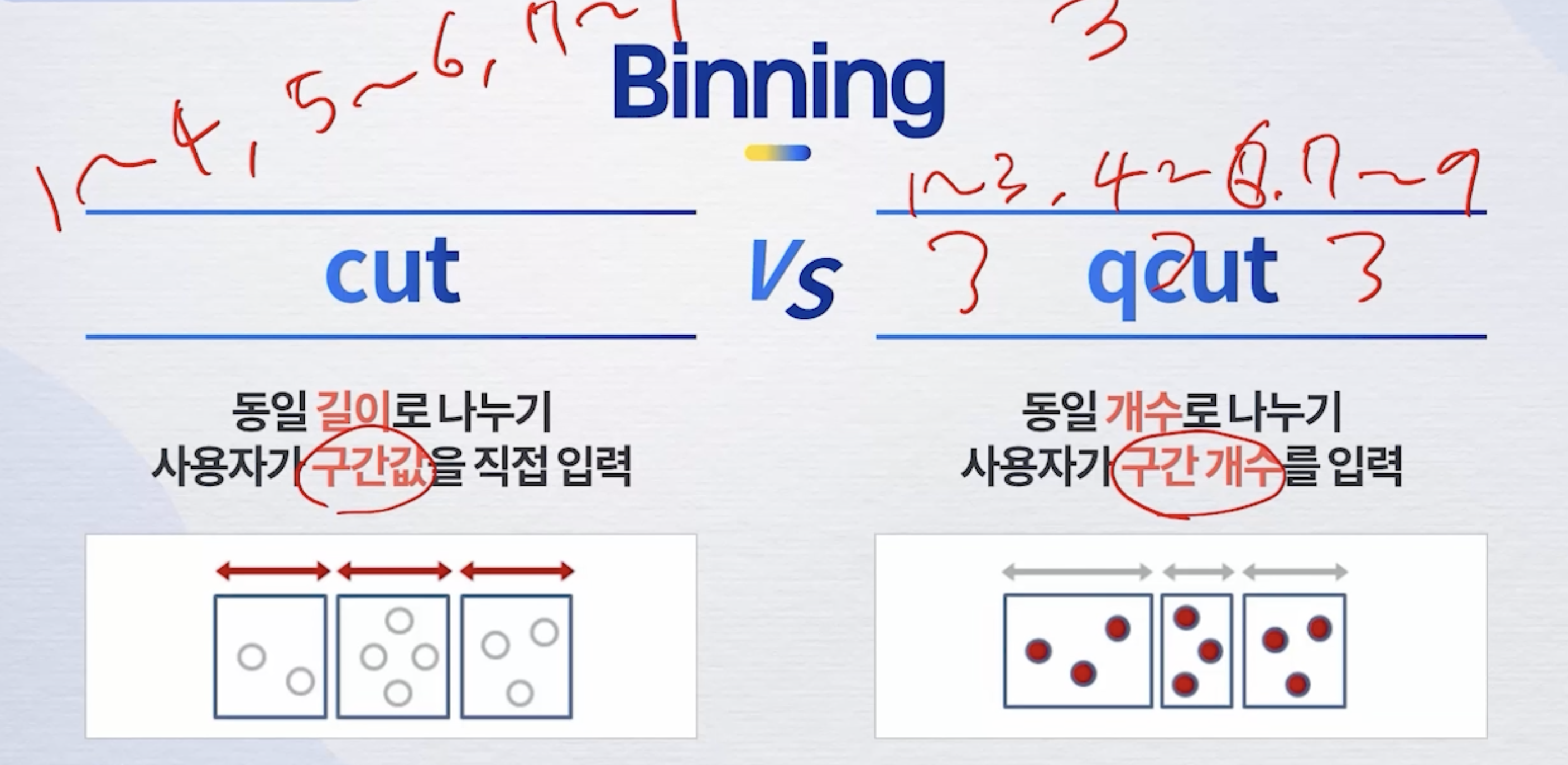 동일 개수로 나누기 사용자가 구간 개수를 입력qcut