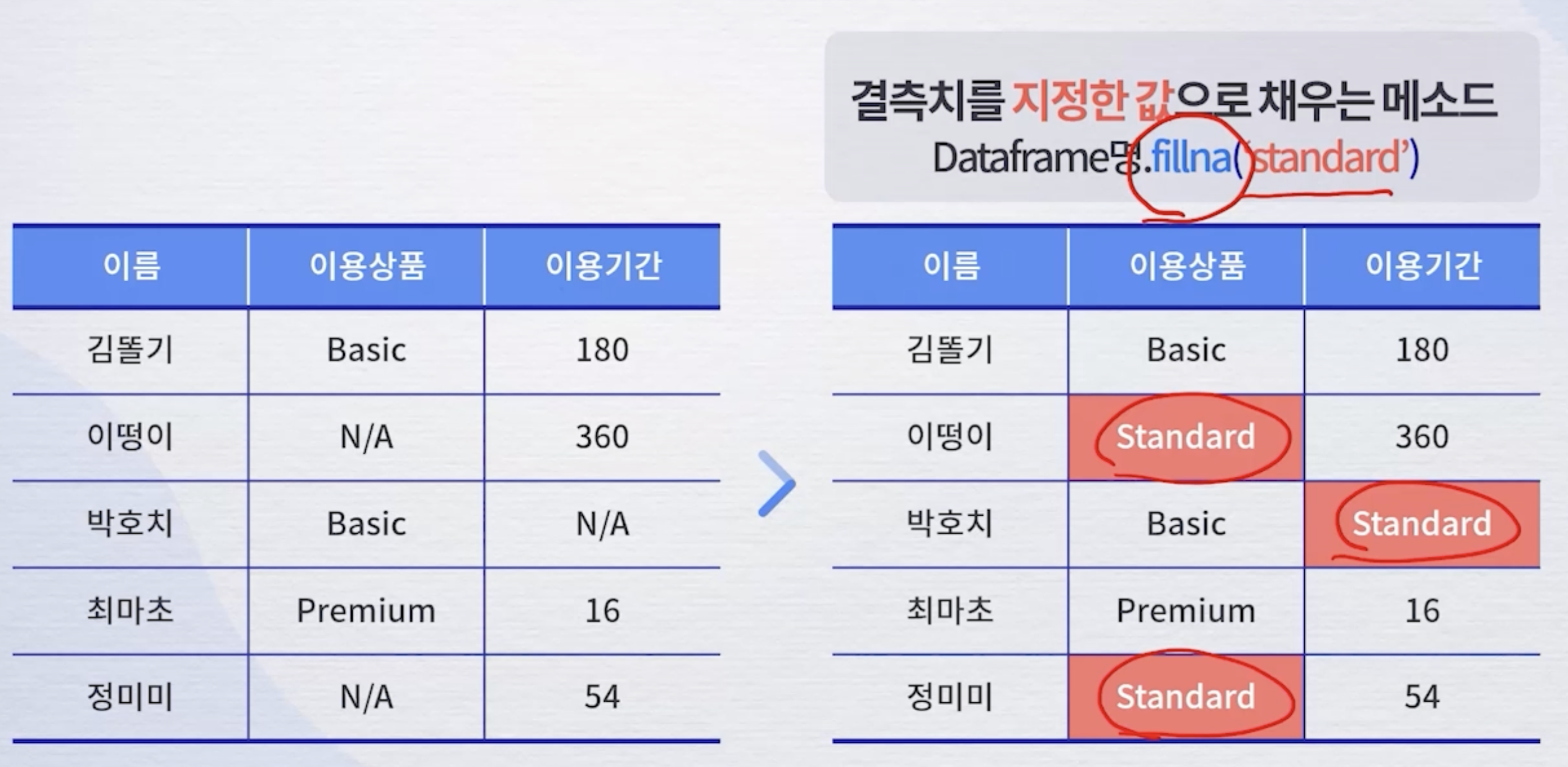 Dataframe명.fillna('standard')