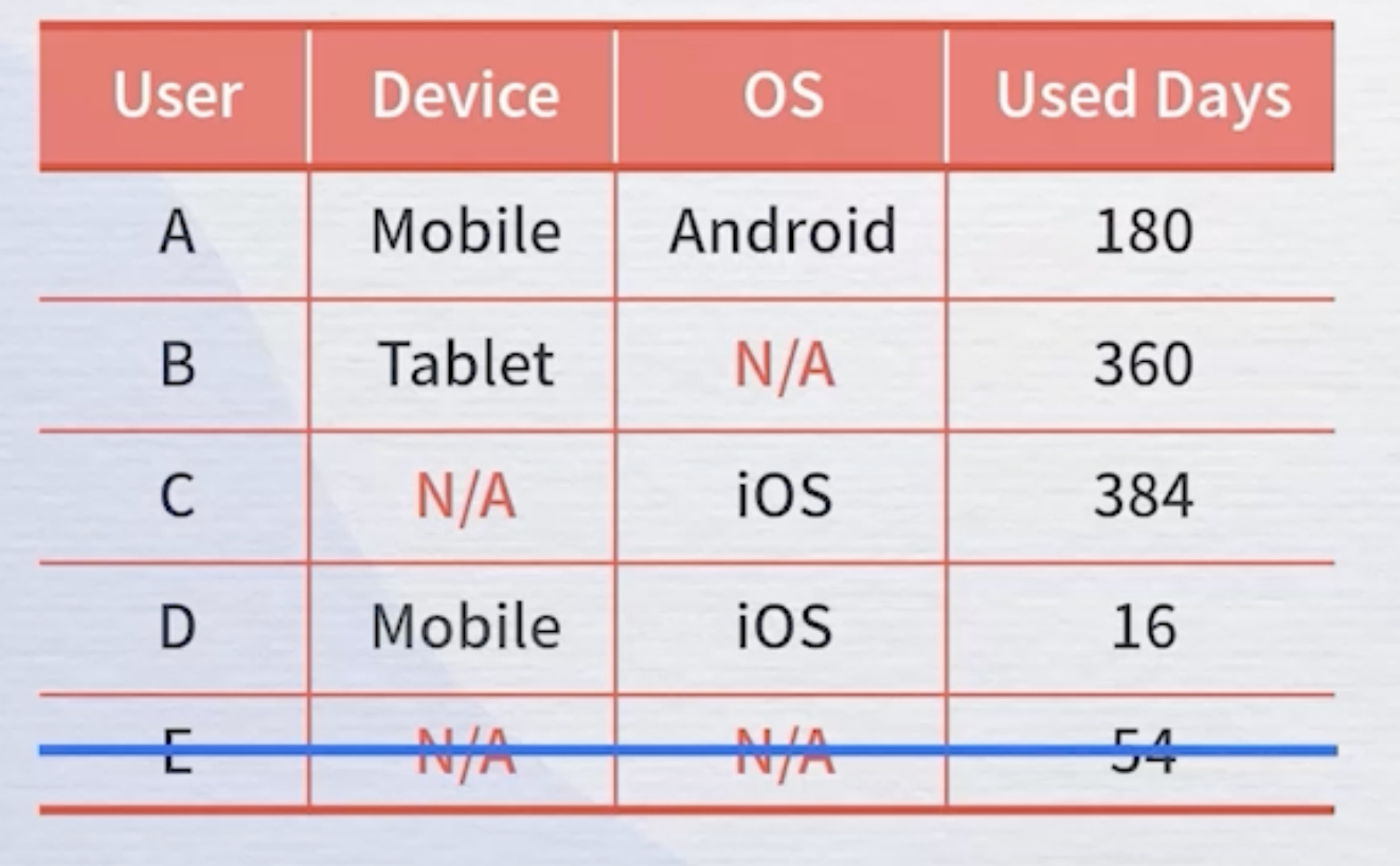 모든 변수가 결측치인 E유저의 데이터만 제거되고 B와C는 유지