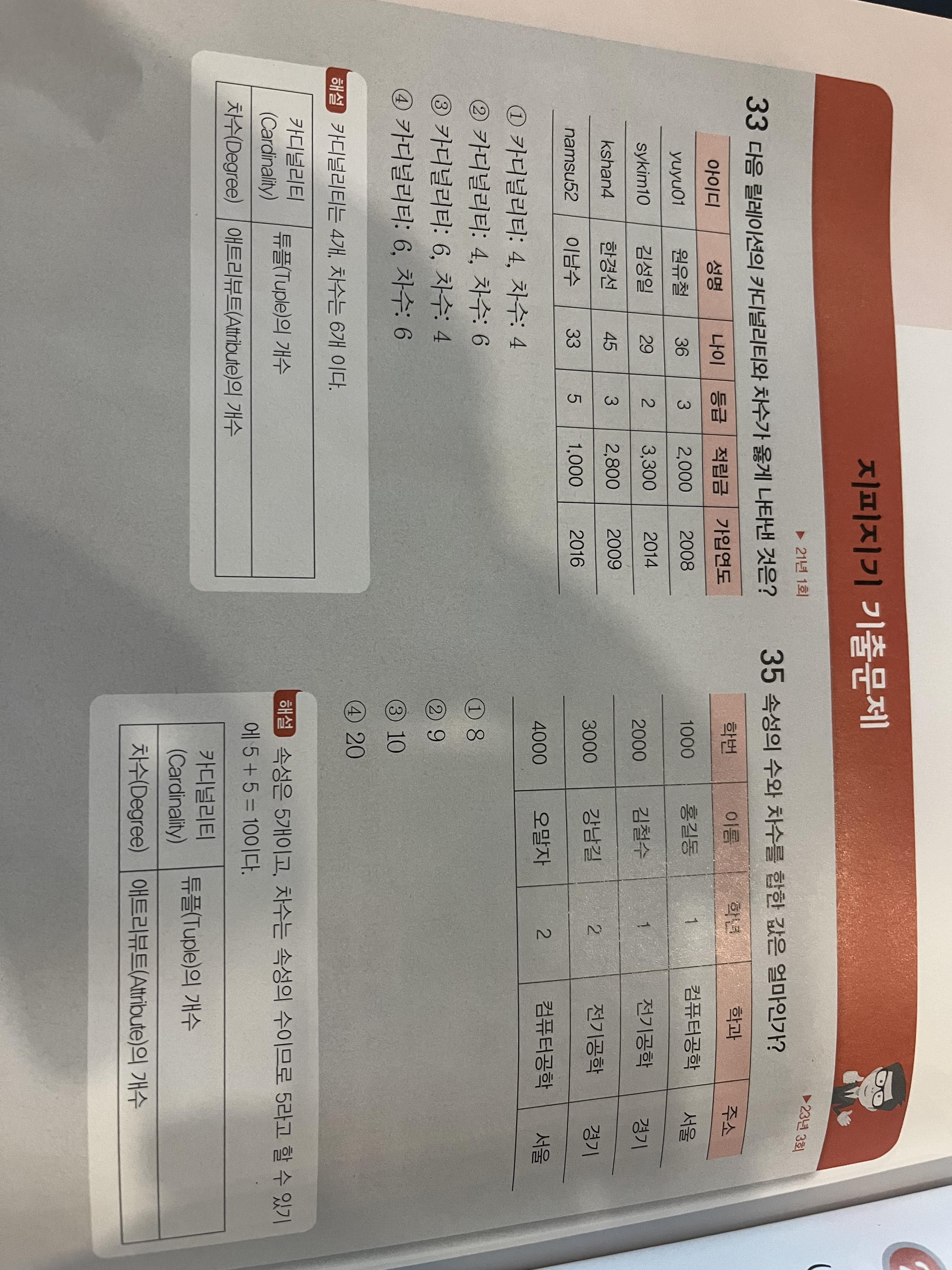 01 에트리뷰트의 수를 차수(Degree), 튜플의 수를 카디널리티(Cardinality)