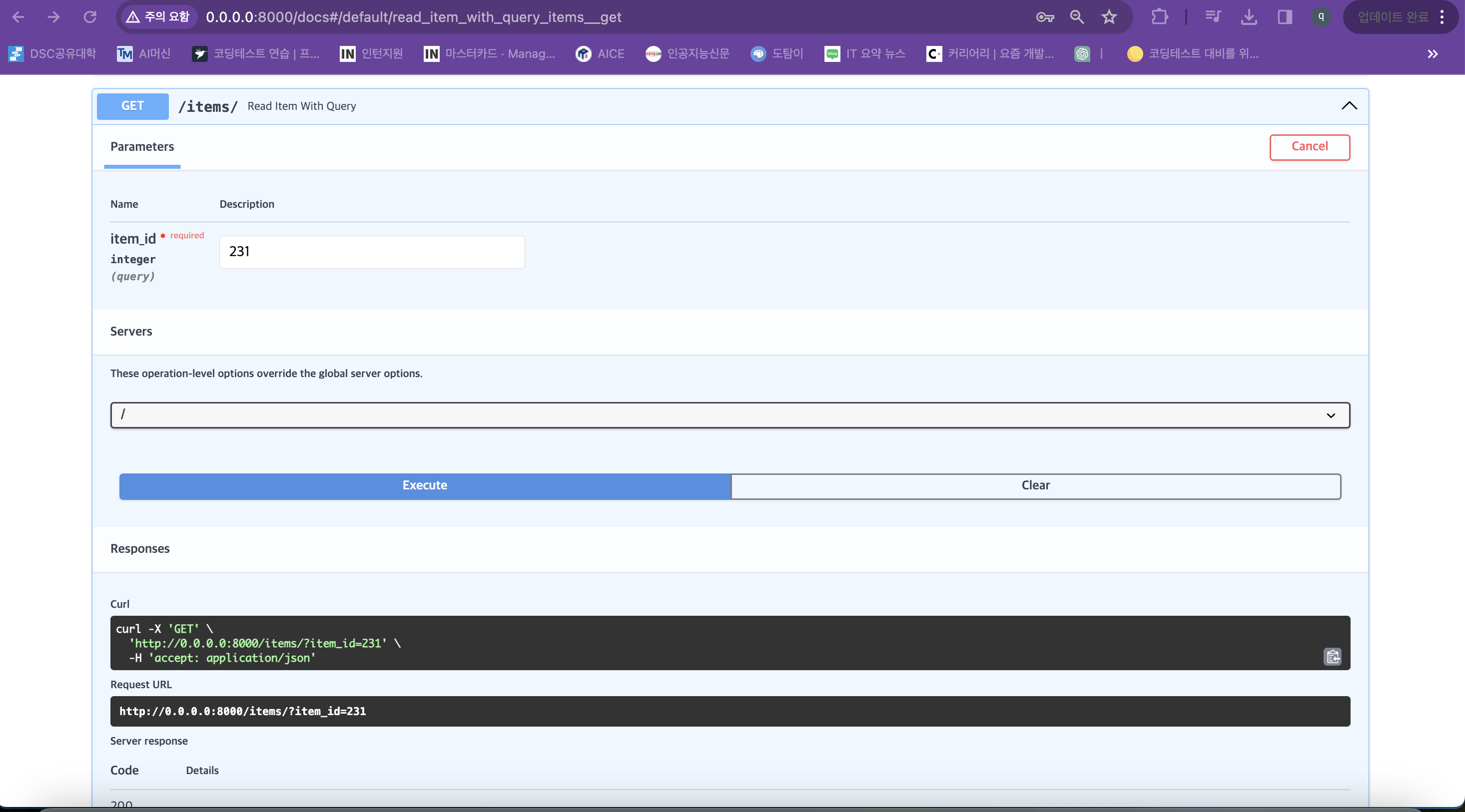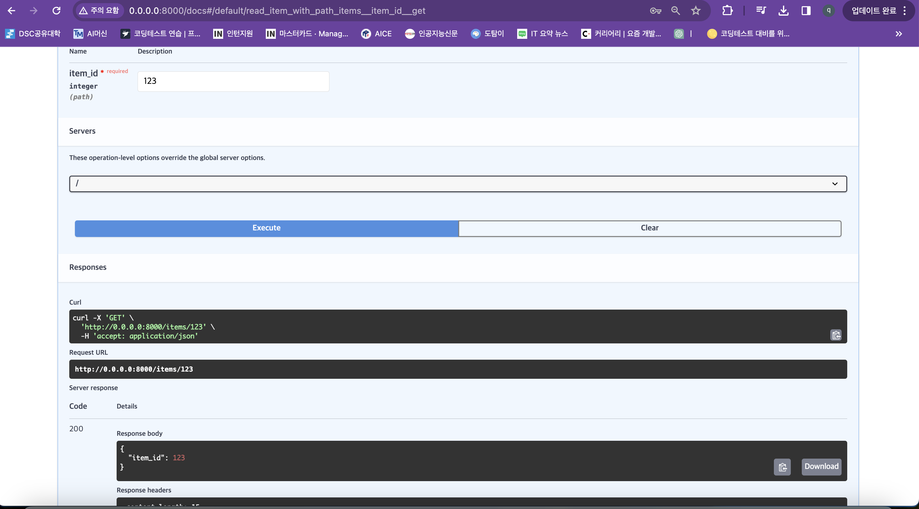 - return ItemCreateOut(item_id=item_id, item_body=item_body): ItemCreateOut 클래스의 객체를 생성하여 반환합니다. 이 객체는 새로운 항목의 item_id와 item_body를 포함하고 있습니다. 이것이 클라이언트에게 반환되어 새 항목이 성공적으로 생성되었음을 알려줍니다.