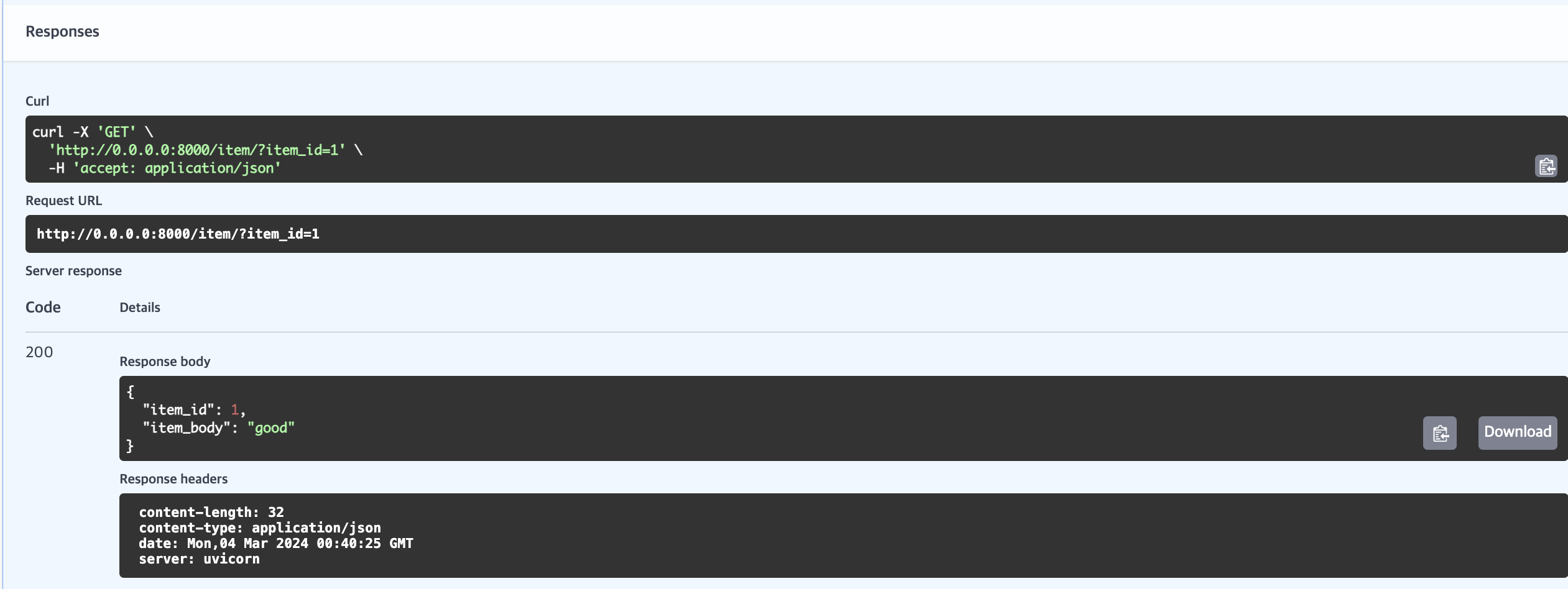 - ITEMS[item_id] = item_body: ITEMS 딕셔너리에 새로운 항목을 추가합니다. 이 항목의 키는 새로운 item_id이고 값은 새로운 항목의 내용인 item_body입니다.